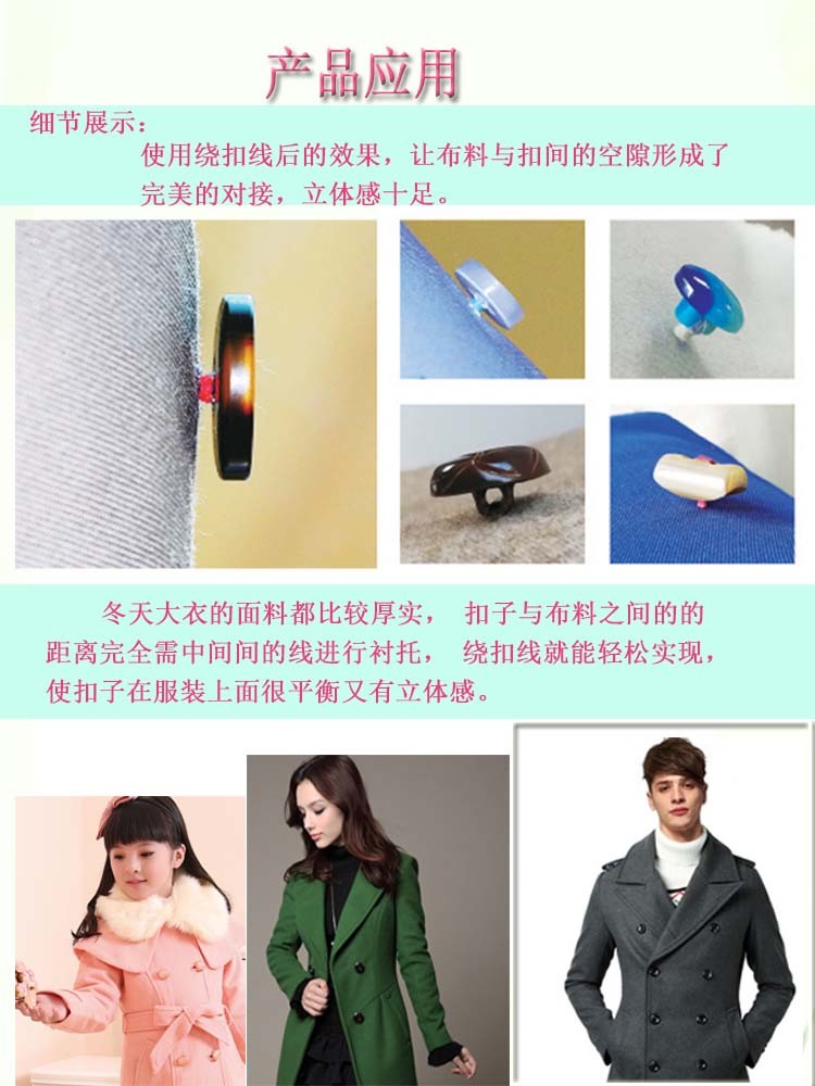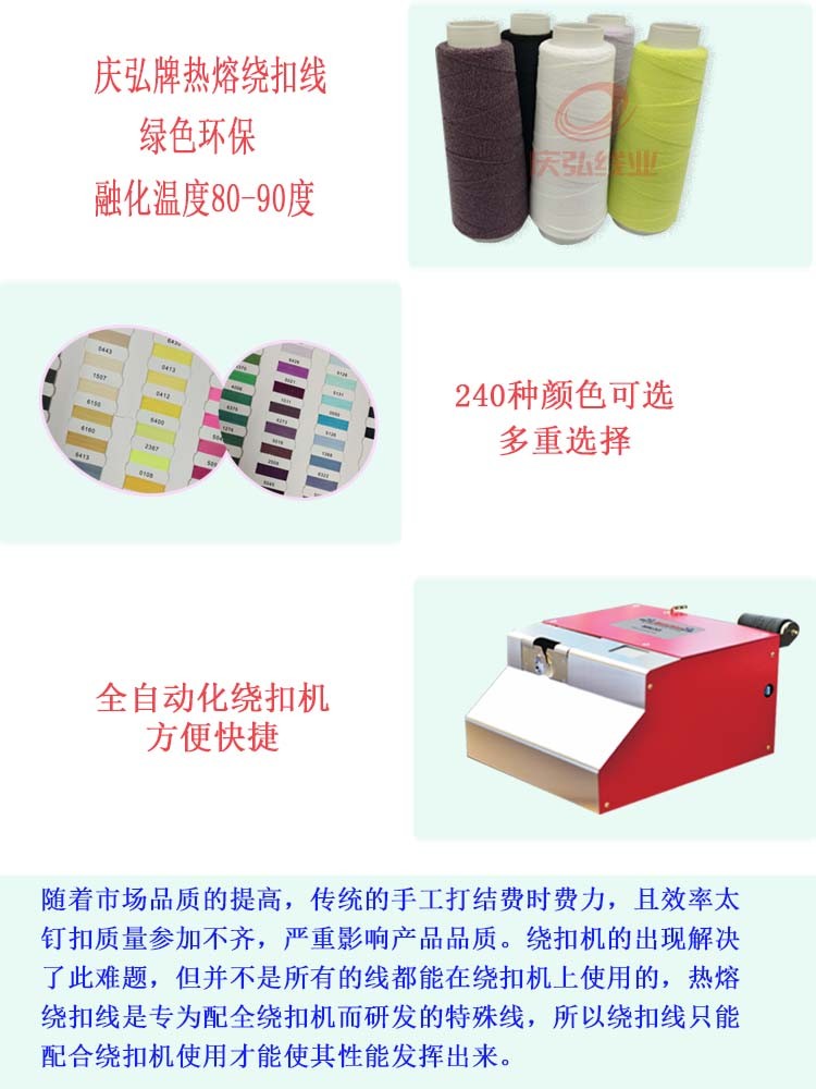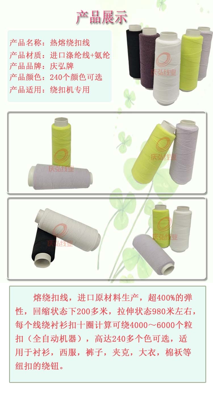 热熔(róng)绕扣线是用氨纶做(zuò)线芯,外面包缠锦纶热熔丝和有色涤纶丝的一种产品.使用热熔绕扣线就可以在订(dìng)扣时不需用传统方法进行打结(jié),提高工作效率的同时也避免了手工操(cāo)作质量参差不齐而(ér)影响产(chǎn)品的品质.熔绕扣线(xiàn),进口(kǒu)原材料生产,超百(bǎi)分之400弹性,回缩状态下200多米,拉伸状态980米左右,每个线(xiàn)绕衬衫扣十圈计算(suàn)可绕4000~6000个粒扣(全自动机器),高达150多个色可选,适用于衬衫,西服,裤子,夹克,大衣,棉袄等纽扣的绕钮。